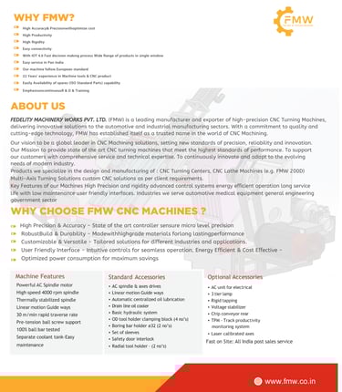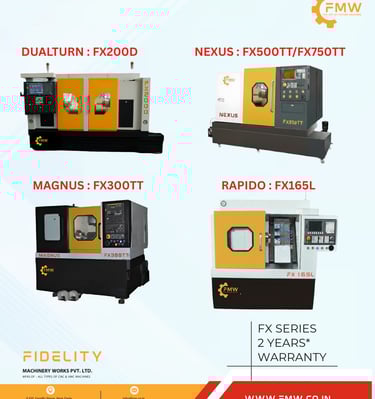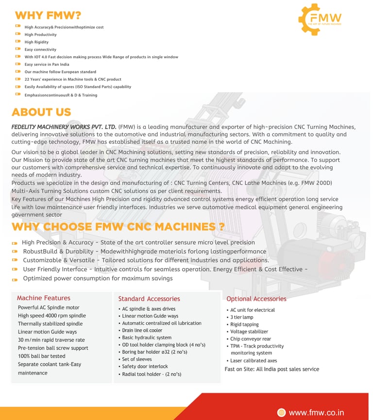 FEDELITY MACHINERY WORKS PVT. LTD. (FMW) is a prominent manufacturer and exporter of high-precision CNC Turning Machines, providing cutting-edge solutions for the automotive and industrial manufacturing industries. With a focus on quality and innovative technology, FMW has built a reputation as a reliable name in the CNC Machining field. Our goal is to become a worldwide leader in CNC Machining solutions, establishing new benchmarks for precision, reliability, and innovation. Our mission is to offer state-of-the-art CNC turning machines that adhere to the highest performance standards. To support our clientele with extensive services and technical know-how. To continually innovate and adjust to the changing requirements of modern industries. Our products focus on the design and manufacturing of: CNC Turning Centers, CNC Lathe Machines (e.g. FMW 200D) Multi-Axis Turning Solutions and custom CNC solutions tailored to client specifications. Key features of our machines include high precision and rigidity, advanced control systems, energy-efficient operation, and long service life with minimal maintenance, along with user-friendly interfaces. Industries we cater to include automotive, medical equipment, general engineering, and the government sector.